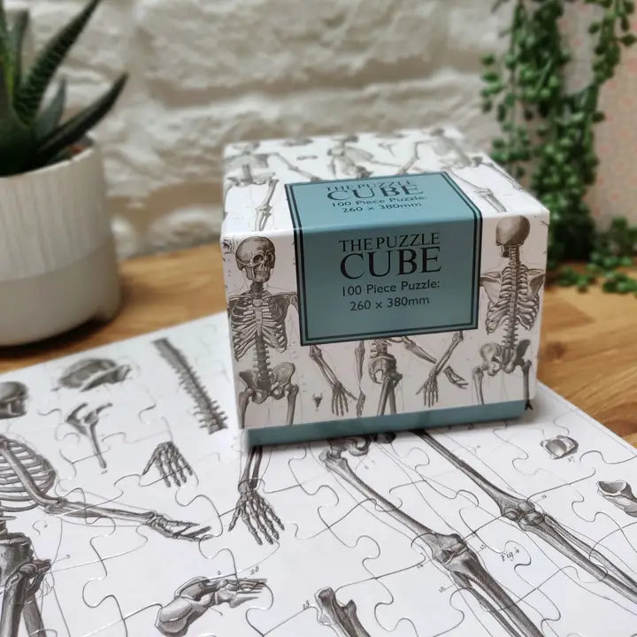 100-teiliges Puzzle im Skeleton-Design. Das Puzzle wird in einer detaillierten Würfelbox präsentiert. Maße der Verpackung: 9 cm x 9 cm x 9 cm. Größe des fertigen Puzzles: 260 mm x 380 mm.