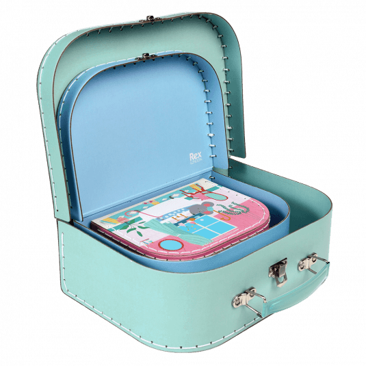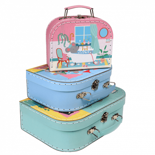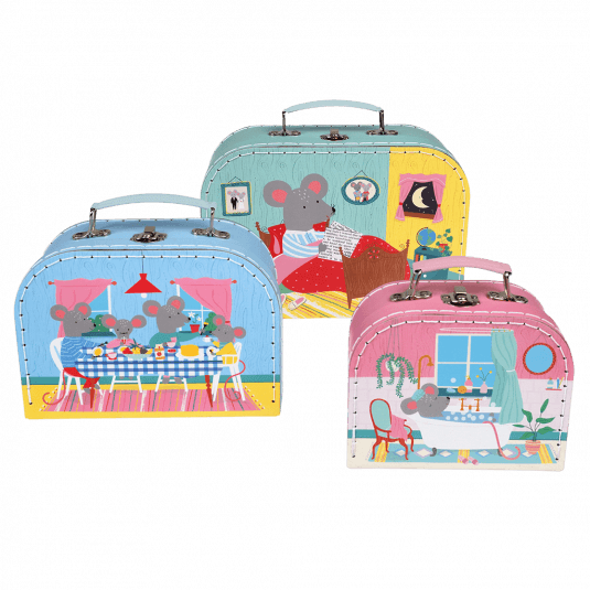 3-teiliges Set mit ineinander passenden Koffern für Kinder, hergestellt aus stabiler Pappe und bedruckt inn unserem Mouse in a House - Design.