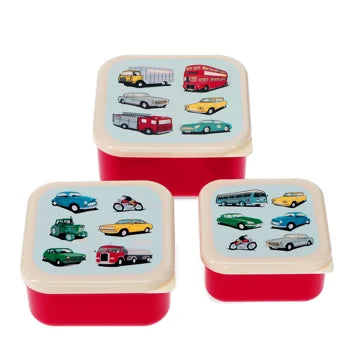 Ein Set mit drei ineinander stapelbaren Snackdosen, die Deckel sind mit den Vintage-Fahrzeugen aus unserem Road Trip - Design bedruckt. Perfekt, um verschiedene Kleinigkeiten auch unterwegs sicher zu transportieren.