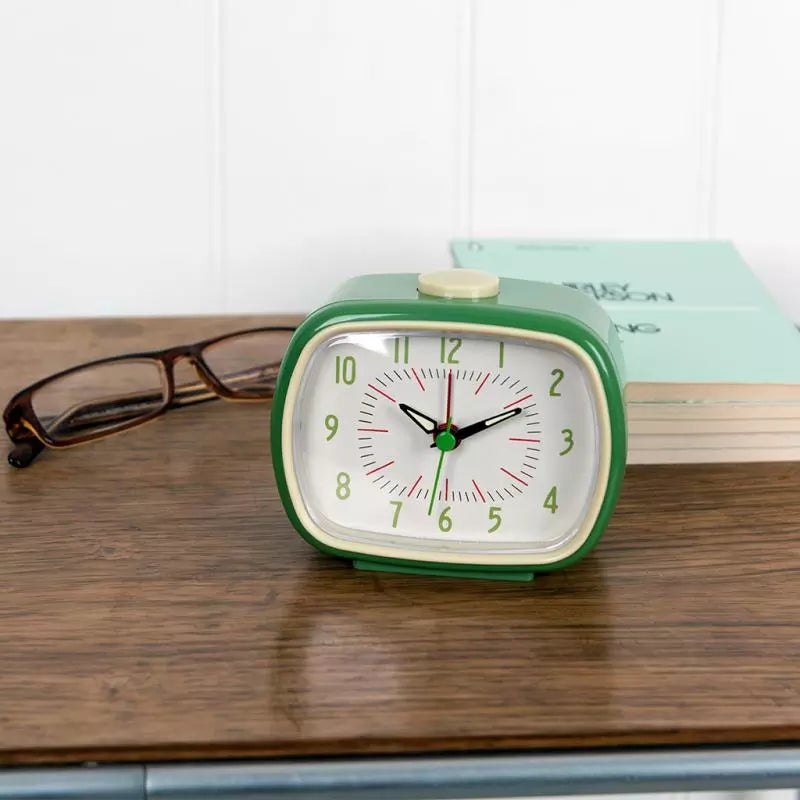 Blauer Wecker im Retro-Stil, die Zeiger leuchten im Dunkeln.