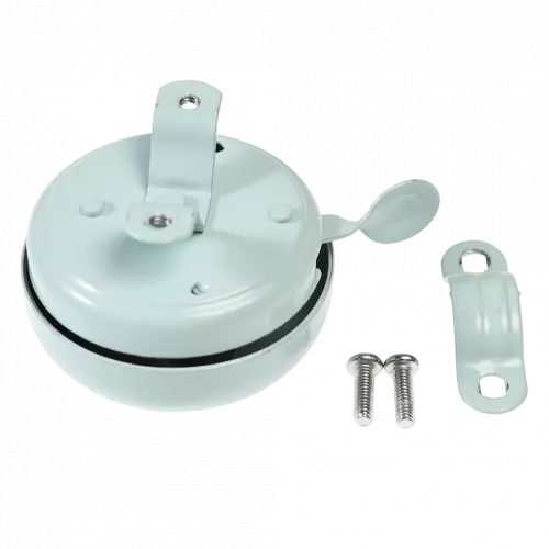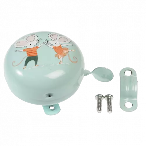 Eine klassische Fahrradklingel in blau, bedruckt mit unserem Maus - Design.