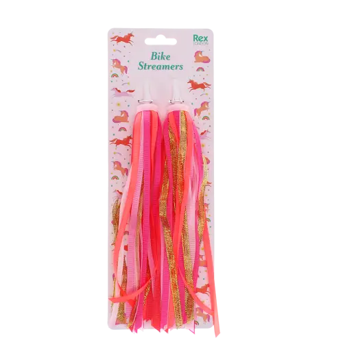 Ein Paar farbenfrohe Fahrraddekorationen mit Bändern, um Kinderfahrräder, Dreiräder oder Roller zu verschönern. Aus unserer Einhorn-Kollektion.