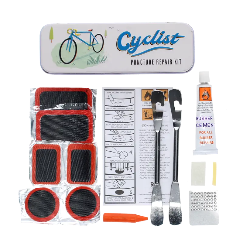 Kompaktes und leichtes Reifenreparaturset – ein unverzichtbares Zubehör für Fahrradtouren. Ideal für eine schnelle Notfallreparatur!