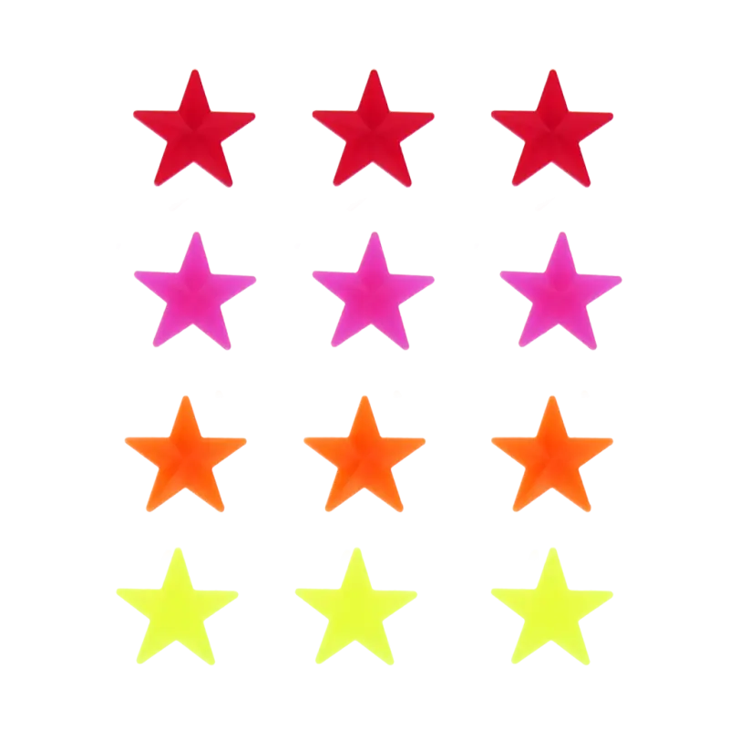 - Sterne in vier verschiedenen Farben (drei Dekorationen pro Farbe): Rot, Pink, Orange und Gelb.