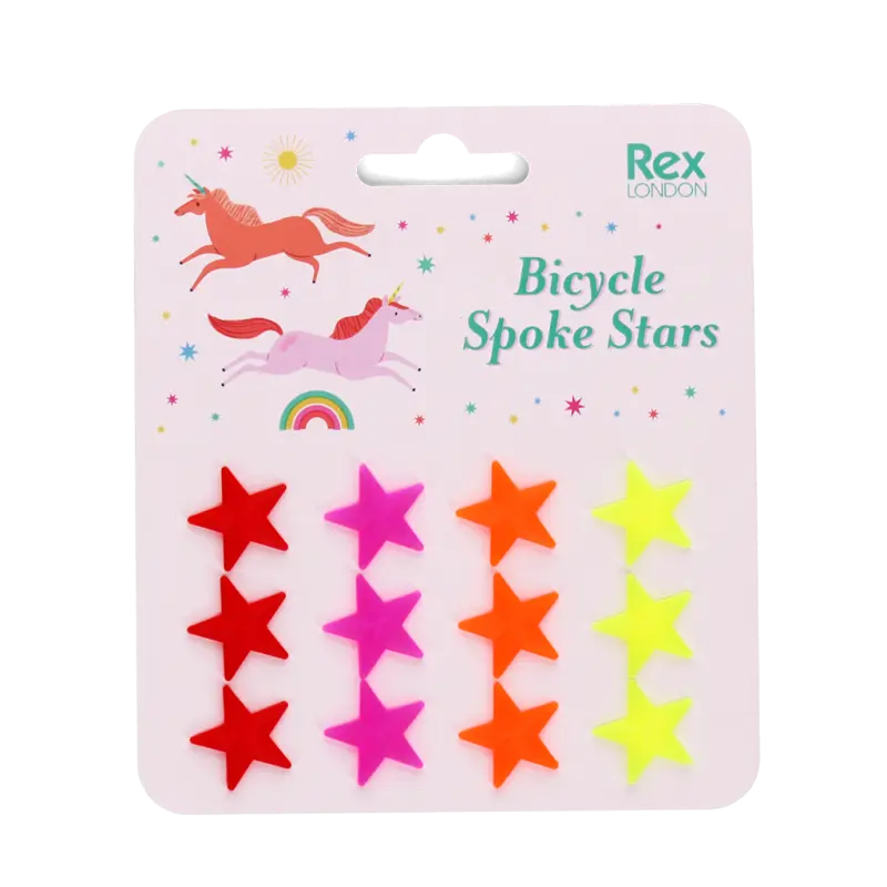 Ein Set mit 12 sternförmigen Dekorationen, die an den Speichen eines Kinderfahrrads befestigt werden können und für Farbe und Flair sorgen. Teil unserer Einhorn-Kollektion.