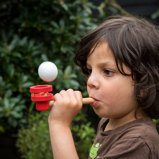 Ein klassisches Geschicklichkeitsspiel, das viele sicher noch aus ihrer eigenen Kindheit kennen. Die Box enhält eine hölzerne Pfeife und zwei Bälle. Blasen Sie in die Pfeife und versuche Sie den Ball so lange wie möglich in der Luft zu halten.