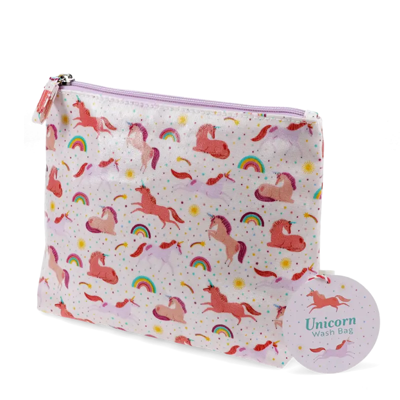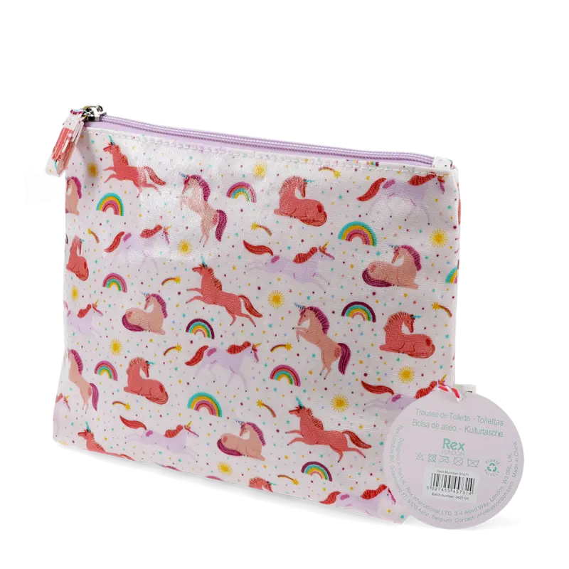 Kinder-Kulturtasche in Blassrosa, bedruckt mit farbenfrohen Einhörnern, Sternen und Regenbögen. Ideal für die Aufbewahrung von Toilettenartikeln und anderen wichtigen Dingen für den Urlaub, Übernachtungen bei Freunden usw.
