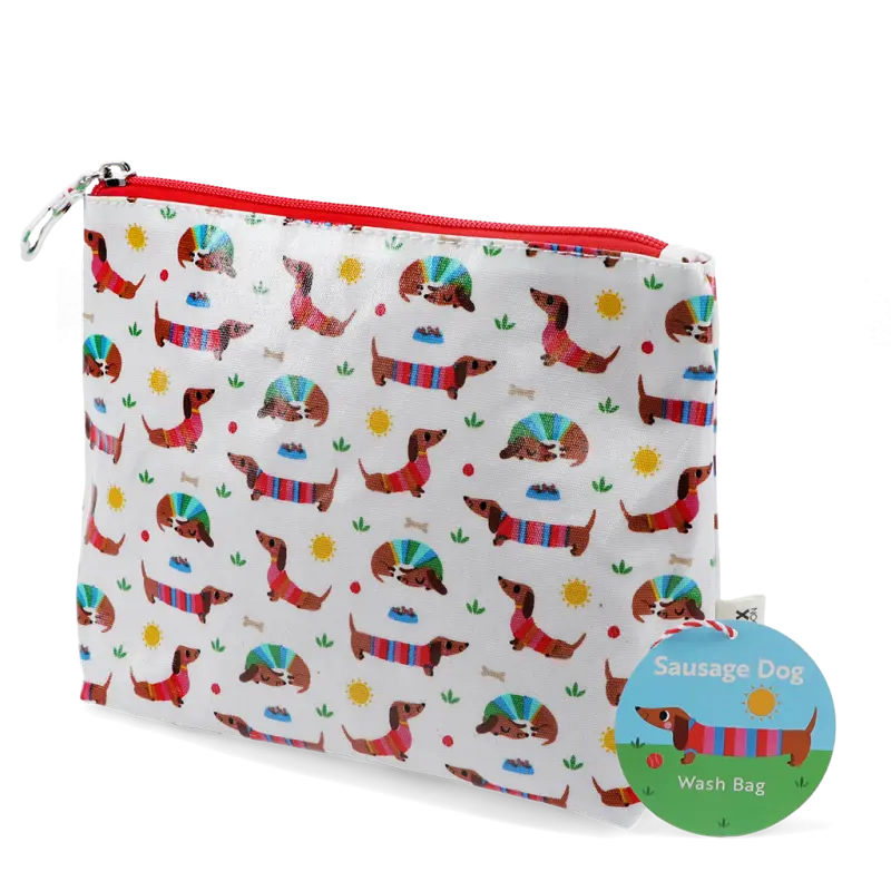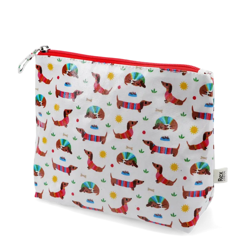 Kinder-Kulturtasche in Weiss, bedruckt mit süßen Dackeln im Sonnenschein. Ideal für die Aufbewahrung von Toilettenartikeln und anderen wichtigen Dingen für den Urlaub, Übernachtungen bei Freunden usw.