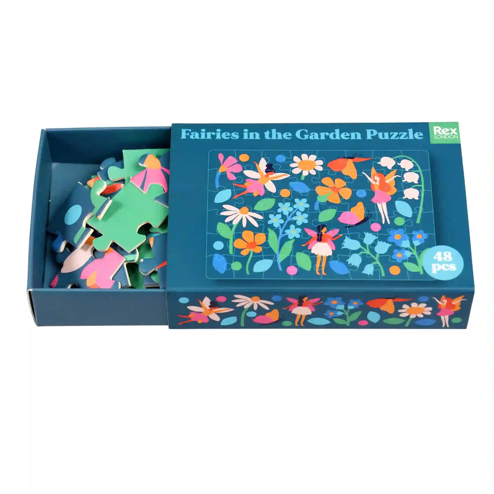 Ein 48-teiliges Mini-Puzzle mit tanzenden Feen und Blumen aus unserem Fairie in the Garden - Design. In der handlicher Größe einer Streichholzschachtel, perfekt für Adventskalender, Party- Bags uvm.