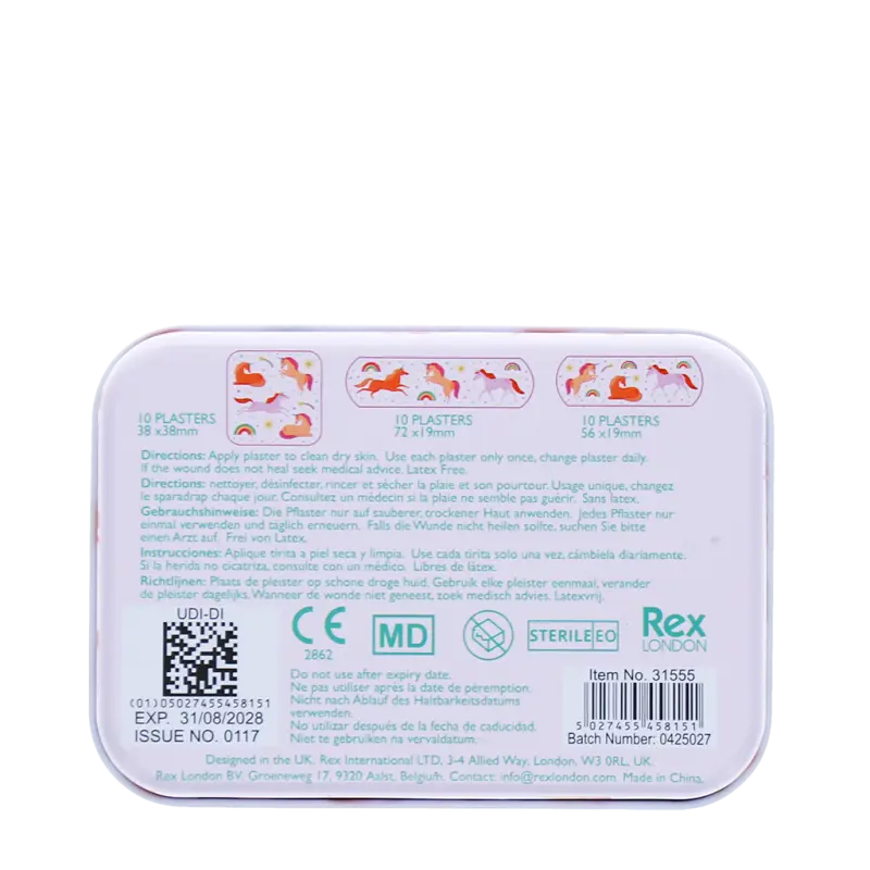 Bedruckte Metalldose mit 30 bunten Pflastern, jedes mit einem farbenfrohen Motiven wie Einhörner, Sternen und Regenbögen. Das perfekte Heilmittel für kleine Verletzungen bei kleineren Kindern. Ordentlich aufbewahrt in einer passenden Dose, ideal für die sichere Aufbewahrung im Medikamentenschrank oder in der Tasche für unterwegs.