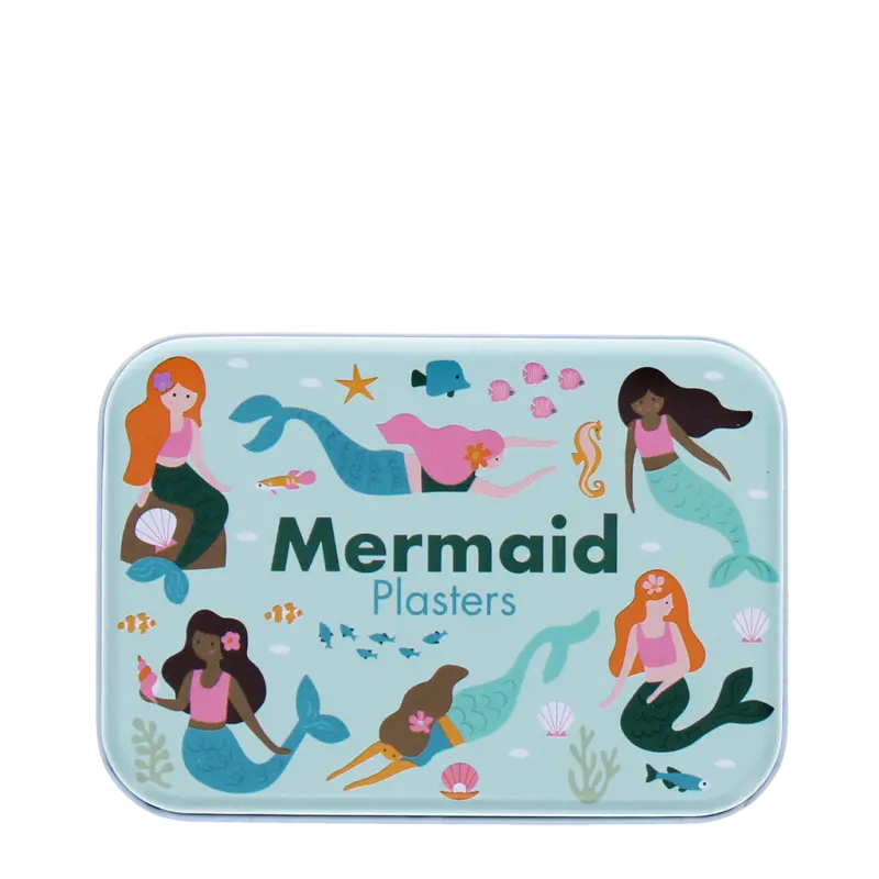Bedruckte Metalldose mit 30 bunten Pflastern, jedes verziert mit einem lustigen Motiv wie Meerjungfrauen, Fischen und anderen Meereskreaturen. Das perfekte Heilmittel für kleine Verletzungen bei kleineren Kindern. Ordentlich aufbewahrt in einer passenden Dose, ideal für die sichere Aufbewahrung im Medikamentenschrank oder in der Tasche für unterwegs.