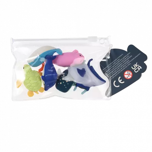 Ein Set mit sechs Radiergummis, jeweils in Form eines Lebewesens aus dem Meer. Darunter ein Walfisch, ein Rochen, ein Seehund und eine Schildkröte.