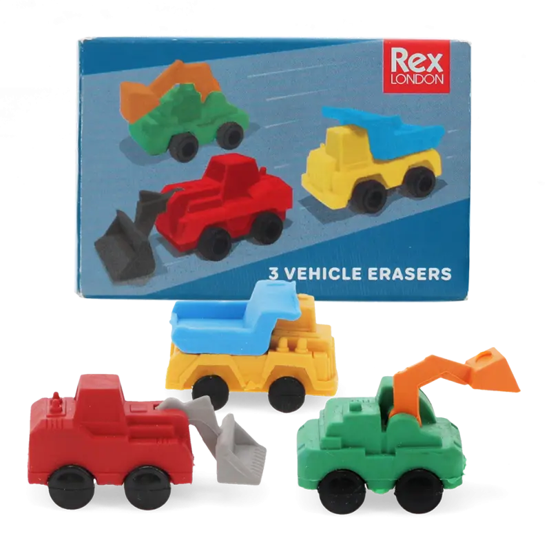 Set mit drei Radiergummis, jeweils in Form eines anderen Baufahrzeugs, mit beweglichen/abnehmbaren Teilen. Lustige und originelle Schreibwaren für jedes Etui.