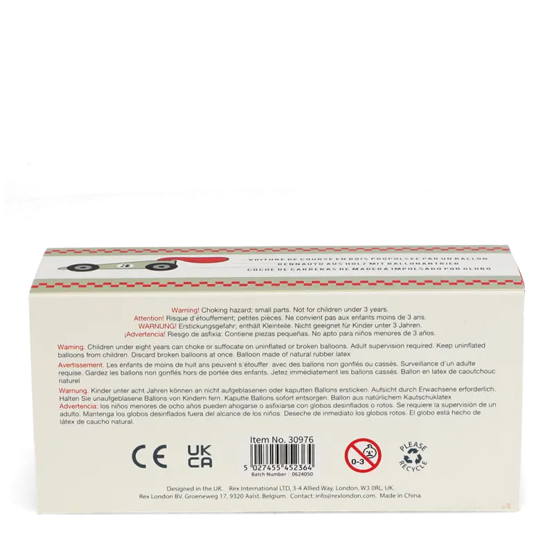 Spielzeugauto aus Holz in schlichtem Design, das sich durch die Kraft der Luft vorwärtsbewegt. Blase einfach den integrierten Ballon auf und lass das Auto auf einer ebenen Fläche los, damit es losrast!
