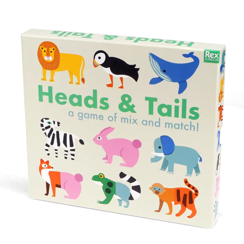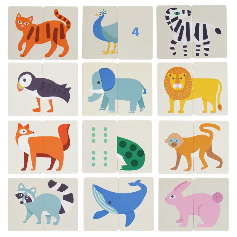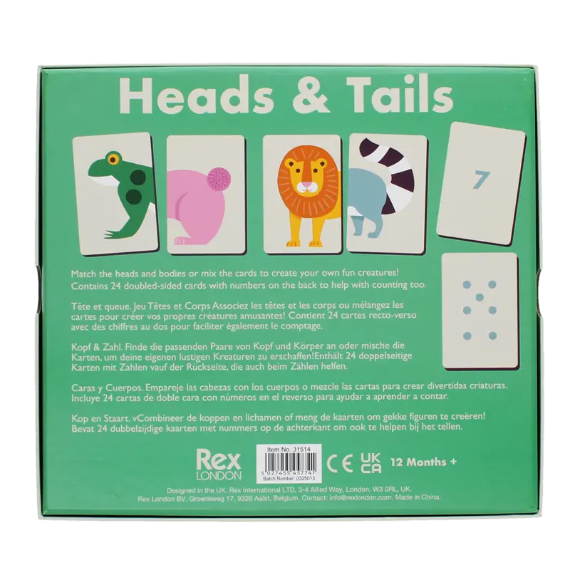 - Die Schachtel enthält 24 doppelseitige Karten mit Tierköpfen oder -schwänzen auf der Vorderseite und einer Zahl oder einem Punktmuster auf der Rückseite.