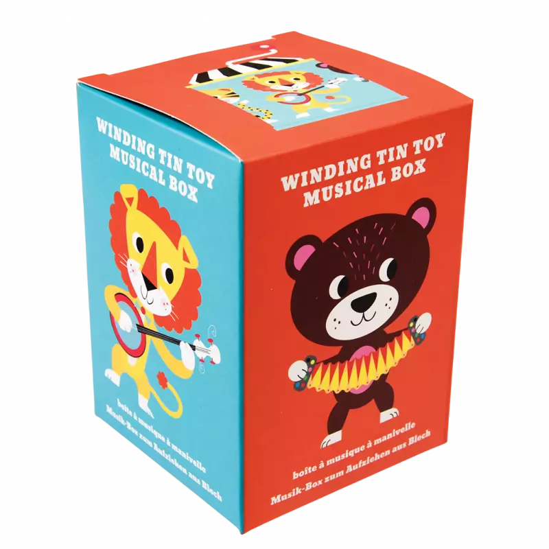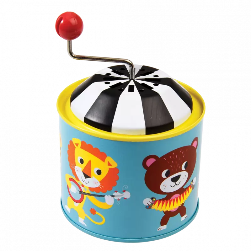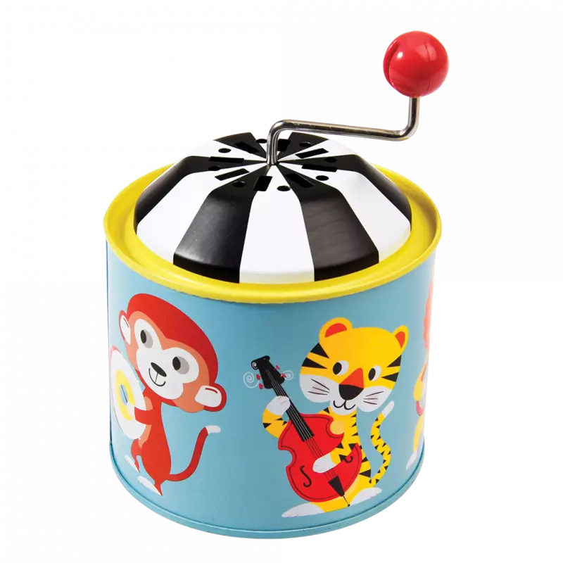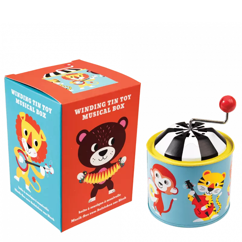Eine klassische, mechanische Spieluhr aus bunt bedrucktem Blech zum Aufziehen - keine Batterien werden benötigt!