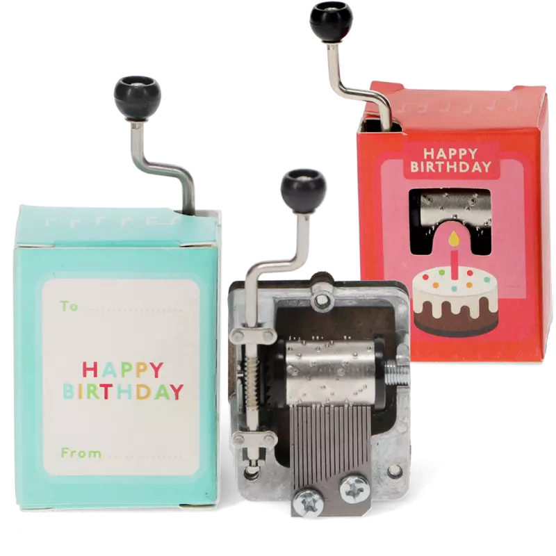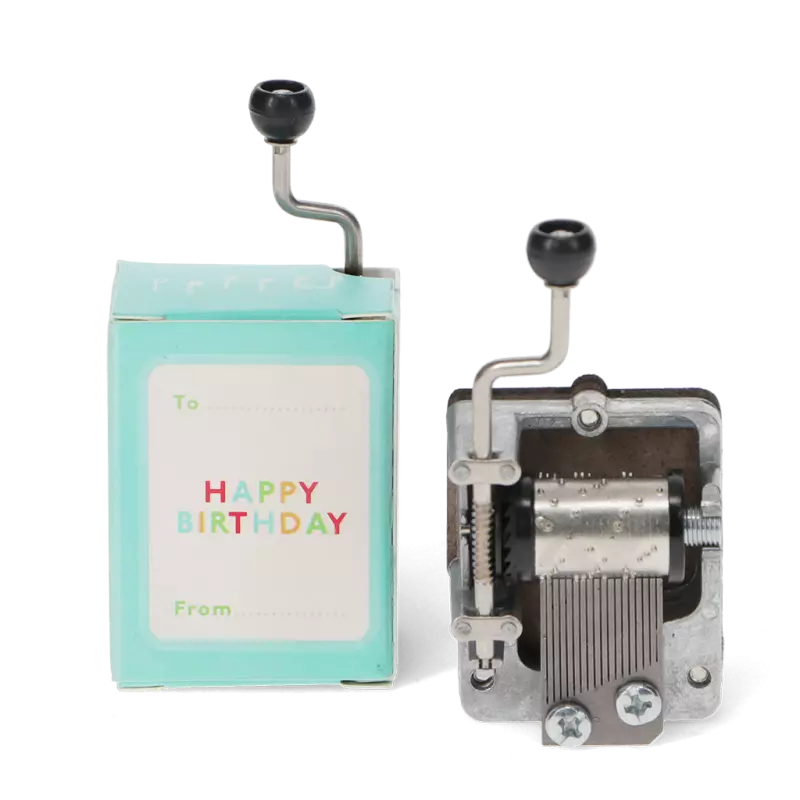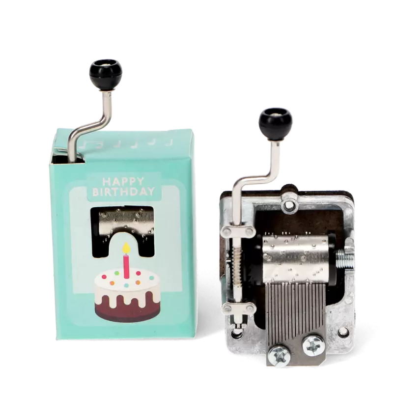 Miniatur-Spieluhr mit Handkurbel, die die Happy-Birthday-Melodie spielt. Ein lustiges und originelles Geschenk für jeden Geburtstag.