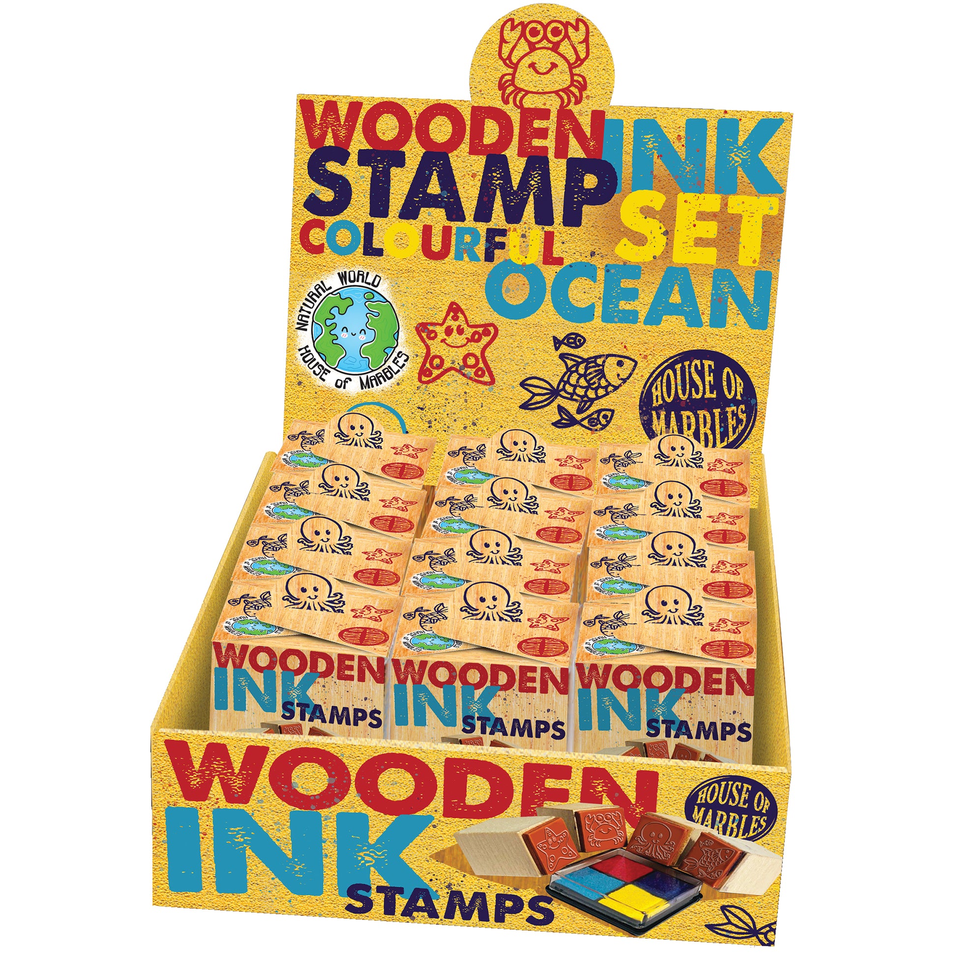 Vier kleine Holzstempel mit Meeresbewohnern, dazu ein vierfarbiges Stempelkissen. Kinder lieben es, ihre Sachen zu personalisieren, und dieses Set ist eine großartige Möglichkeit, Karten, Bücher oder einfach alles zu dekorieren.