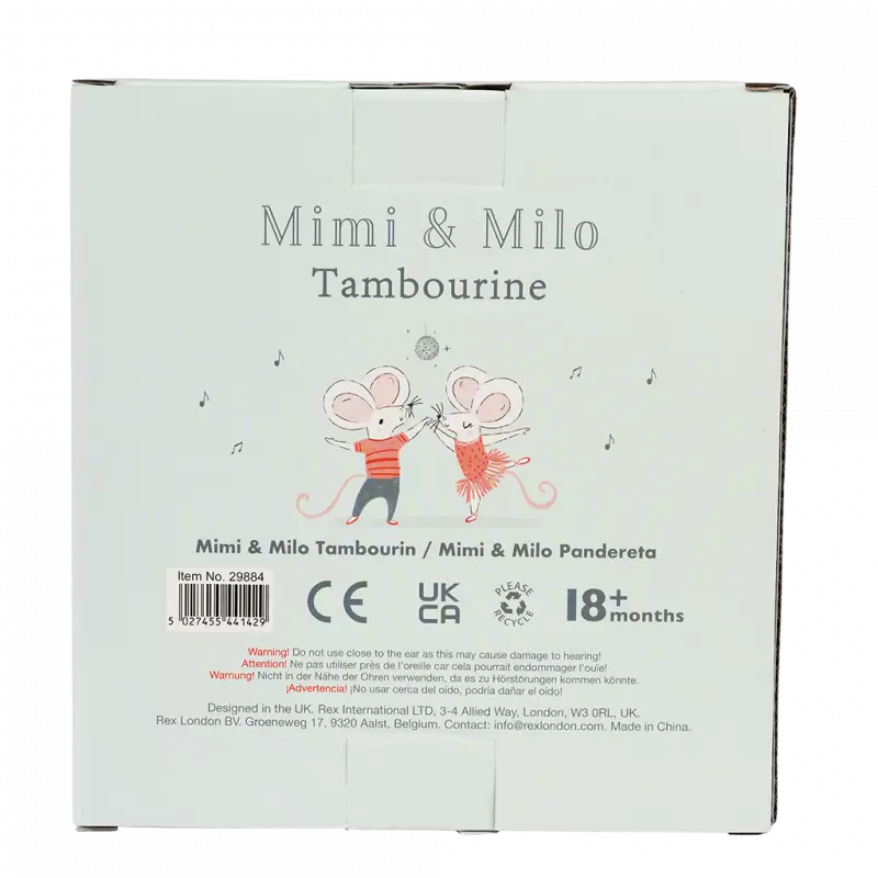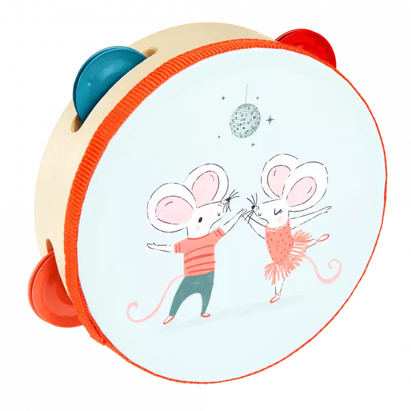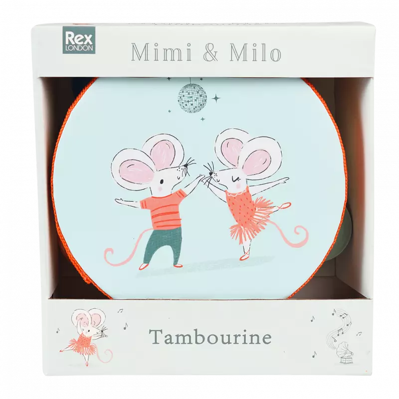 Ein süßes Tamburin, bedruckt mit den tanzenden Mäusen aus unserem Mimi and Milo - Design. Eine fantastische Geschenkidee für musikbegeisterte Kleinkinder.