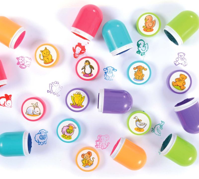 ... 10 süße Tiermotiv-Stempel zum Basteln, für Einladungskarten, als Mitgebsel oder kleines Überraschungsgeschenk. Das Gehäuse hat die gleiche Farbe wie das Stempelmotiv. Die passen sogar in die Hosentasche.