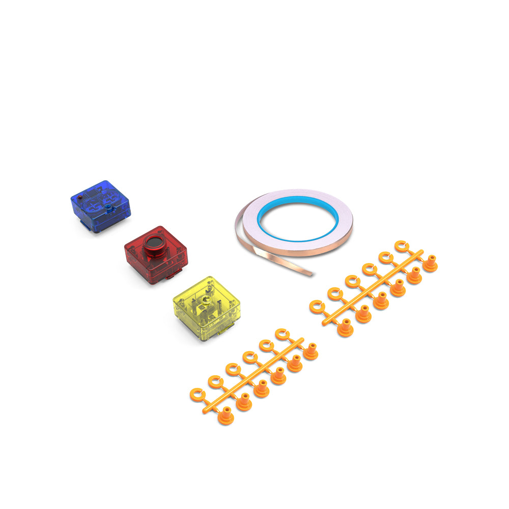 Inhalt: Batterieblock, Lichtblöcke, Soundblöcke, Klammerset, farbige Aufkleber, Karton, Kupferband, Stäbchen, Drähte, ausführliche Anleitung