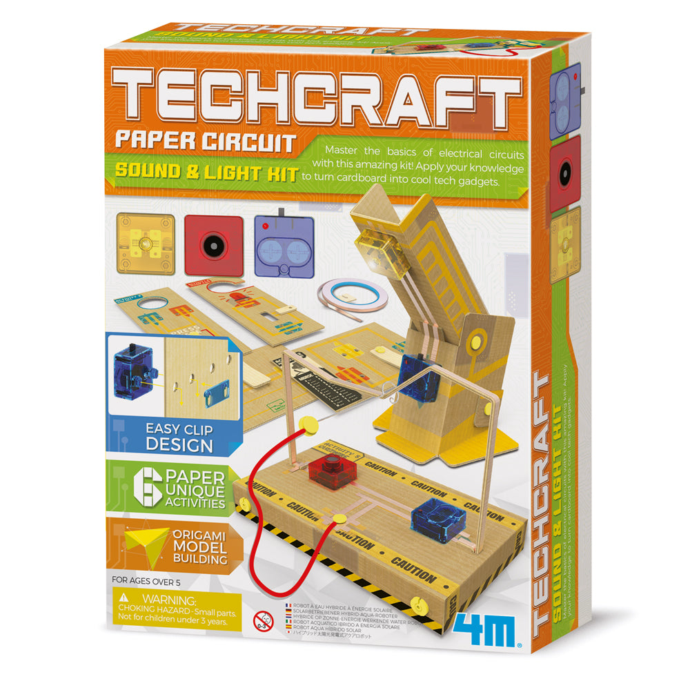 Mit dem Ton und Licht Bausatz mit Papierschaltkreis lernt ihr die Grundlagen einer elektrischen Schaltung. Mit Hilfe des Origami-Bausatz kann ein einfaches Stück Karton zum Leben erweckt werden. Erlerne die Grundlagen einer elektrischen Schaltung mit diesem erstaunlichen Bausatz. Wende dein Wissen an, um aus Pappe coole technische Gadgets zu machen.